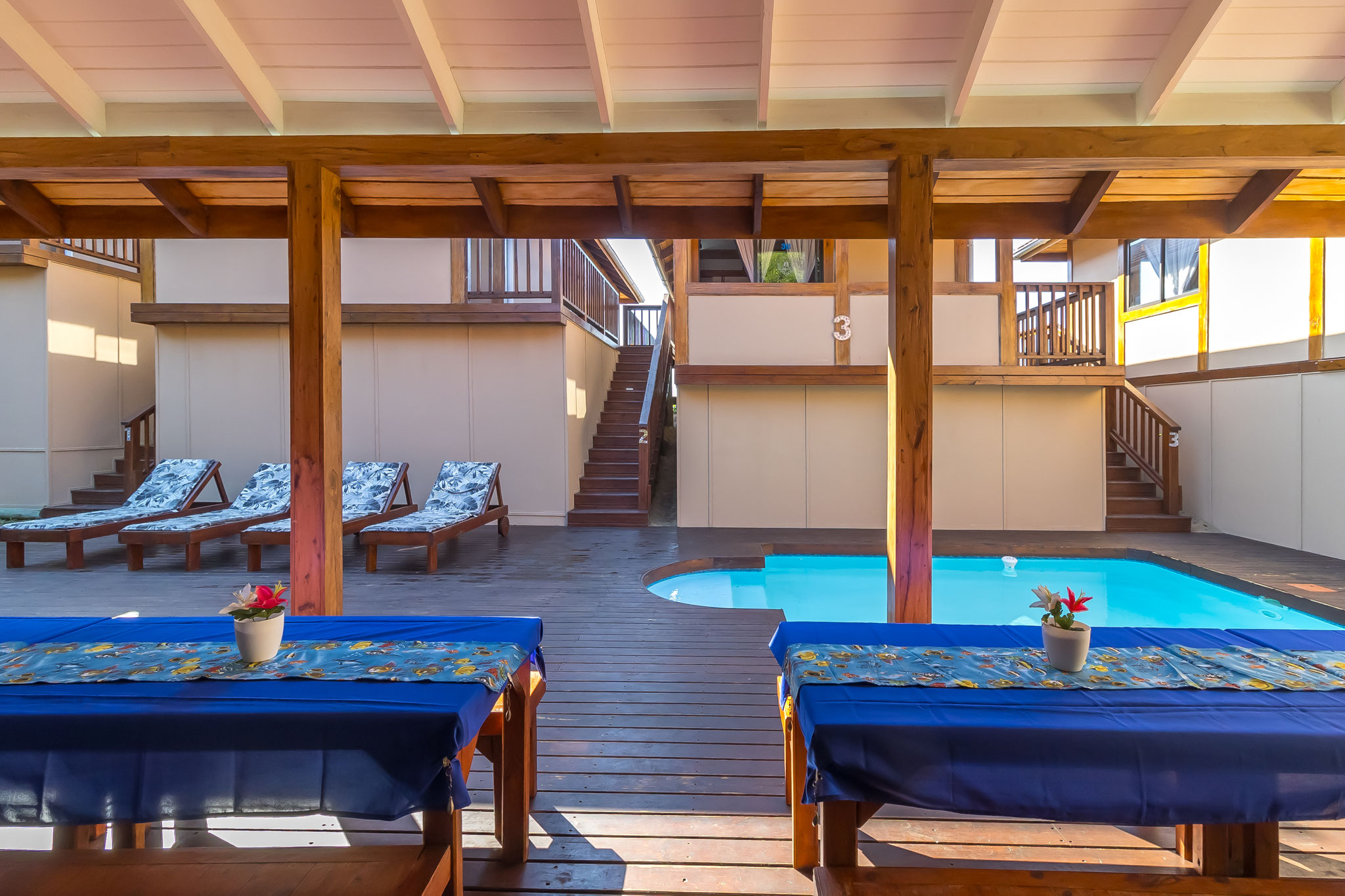 Also lounge at the pool, shared by all the chalets, where there is a large kitchen and dining patio available to all residents.
